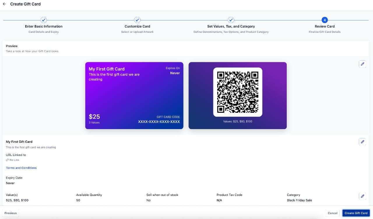 - Crear tarjetas personalizadas: Define nombre, diseño, condiciones, fecha de expiración y múltiples denominaciones.