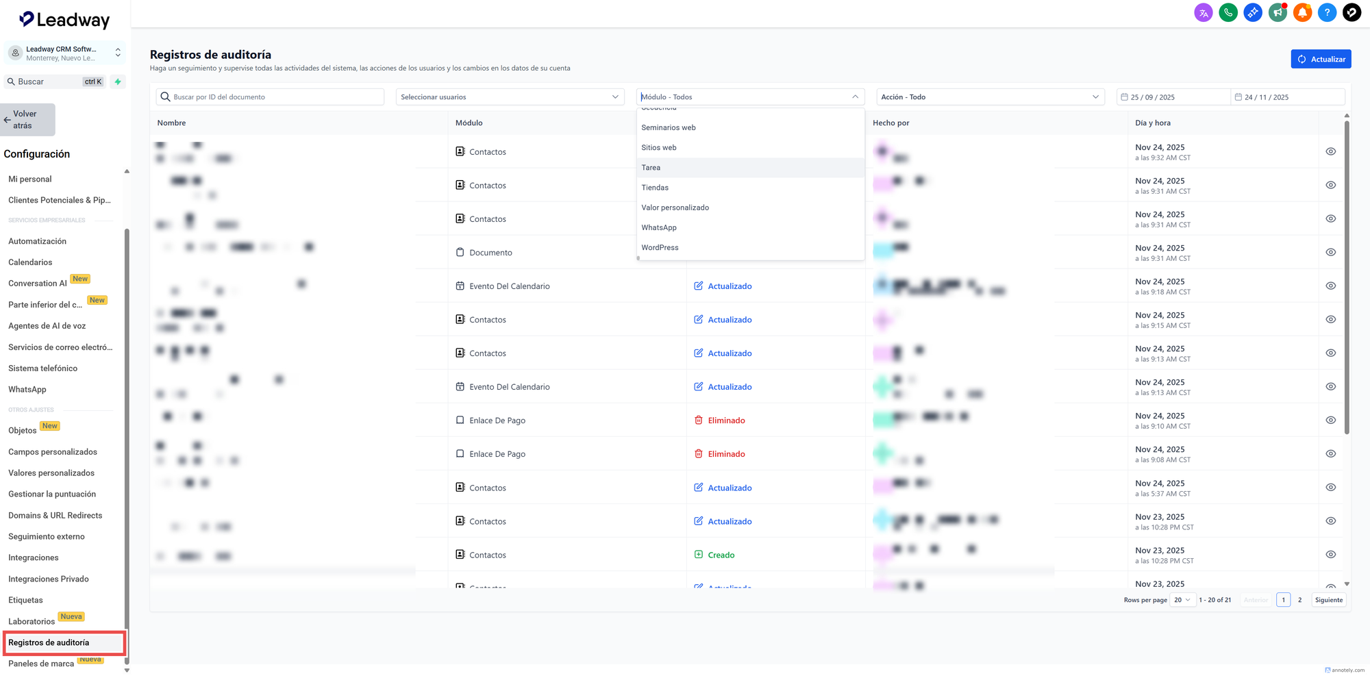Ingresa a Configuración → Registros de Auditoría y utiliza el nuevo filtro "Módulo" para segmentar los registros por herramienta.