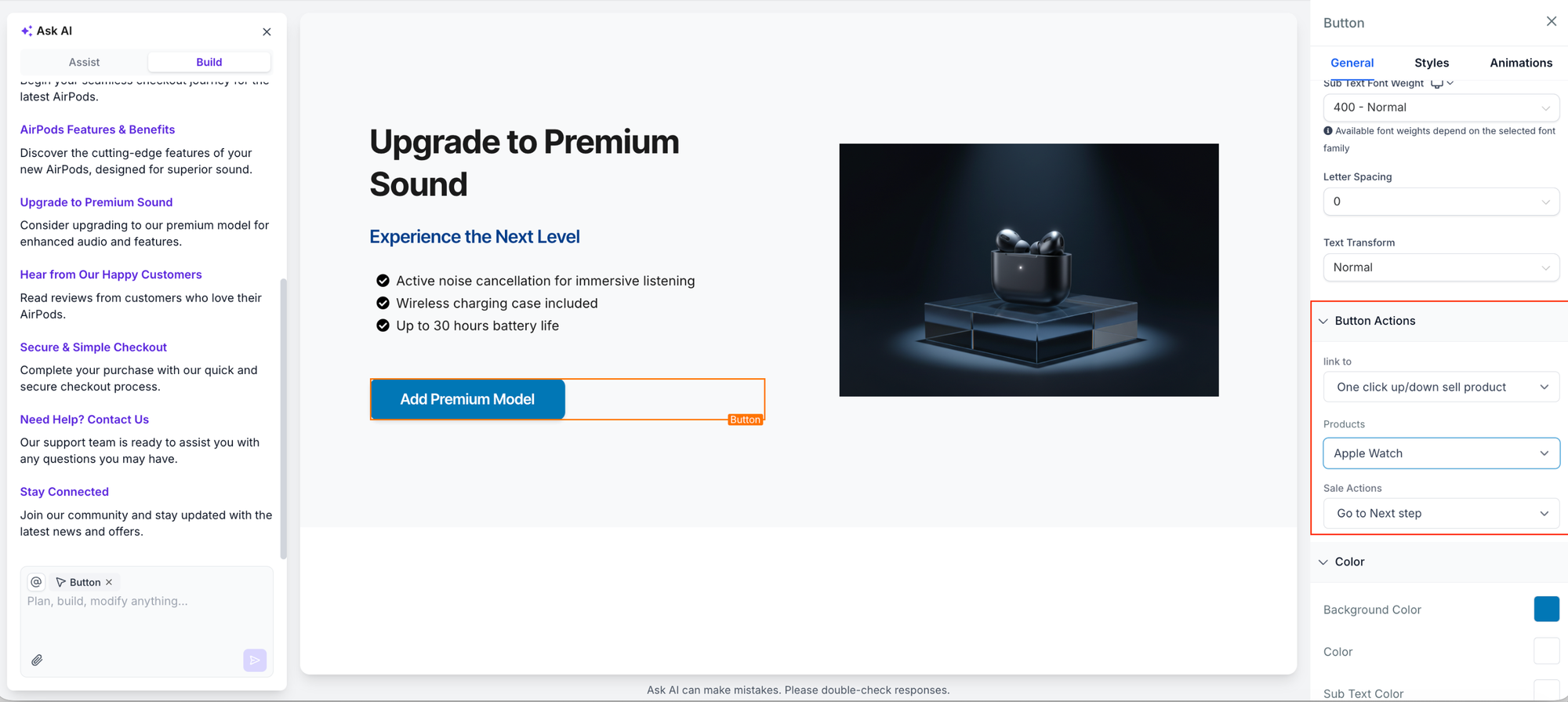 En el siguiente paso del embudo, configura un botón con acción de "Upsell Product". - Muestra el resumen del pedido: