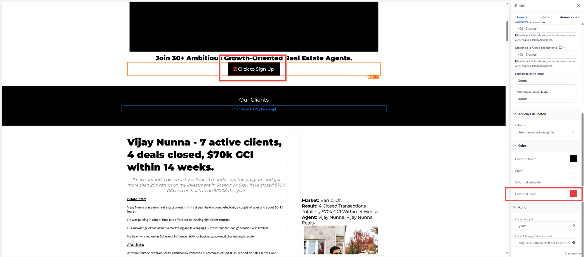 Constructor de Páginas → Agregar Elemento → Ajustes → Color de Ícono / Secciones Guardadas