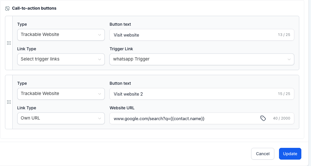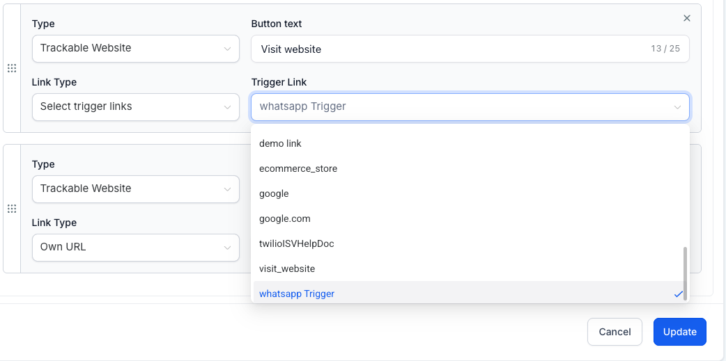- Botones con Trigger Links: Agrega enlaces rastreables directamente en botones dentro de cualquier plantilla de WhatsApp V2.