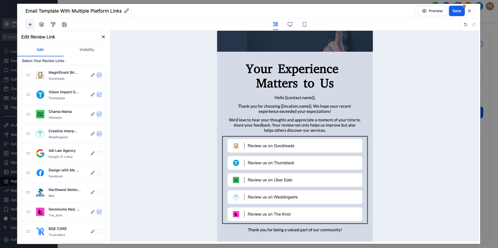 En Leadway hemos mejorado el constructor de correos para gestión de reputación, permitiéndote incluir múltiples enlaces a diferentes plataformas de reseñas en un mismo email.