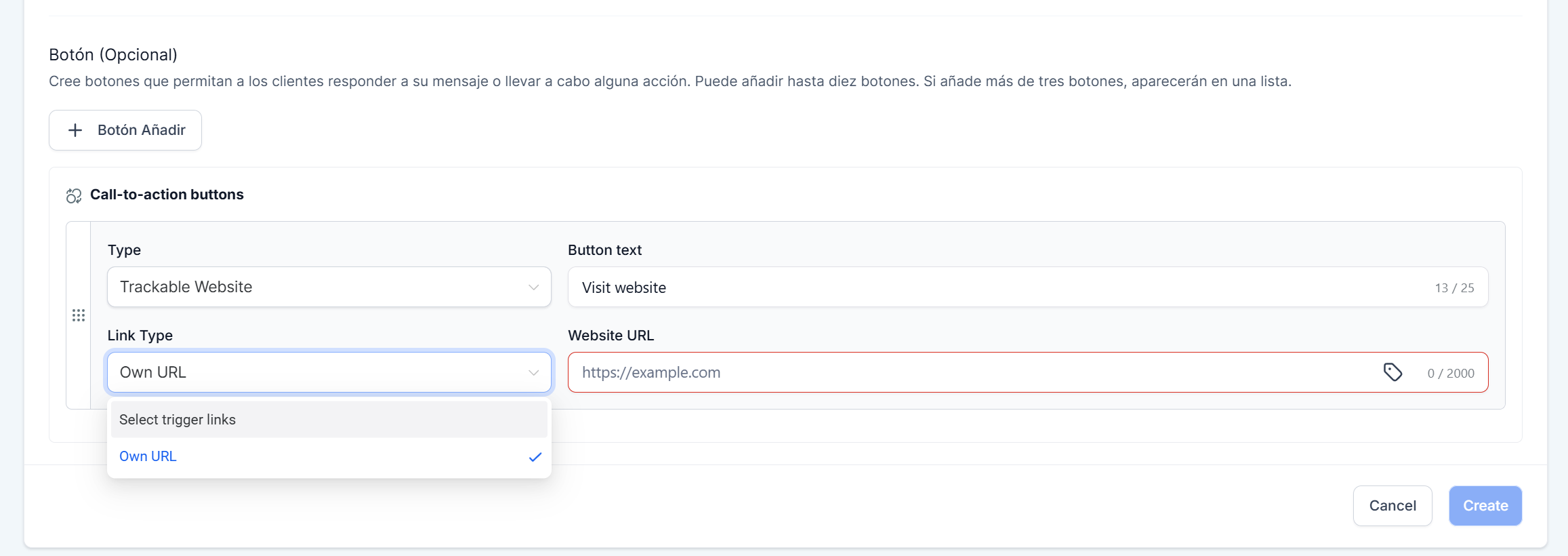 - Botones con Trigger Link: añade enlaces rastreables a cualquier botón en tus plantillas de WhatsApp V2.