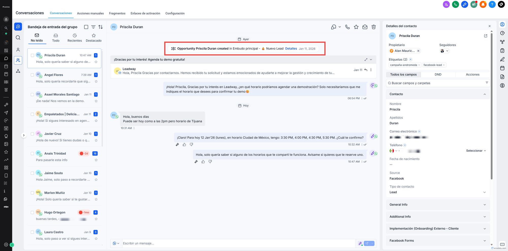 Atendiendo a los comentarios de usuarios, Leadway ha implementado mejoras visuales en la interfaz de la página de conversaciones. Estas optimizaciones están diseñadas para hacerla más clara, accesible y cómoda a la vista, ayudándote a interactuar mejor con tus clientes.