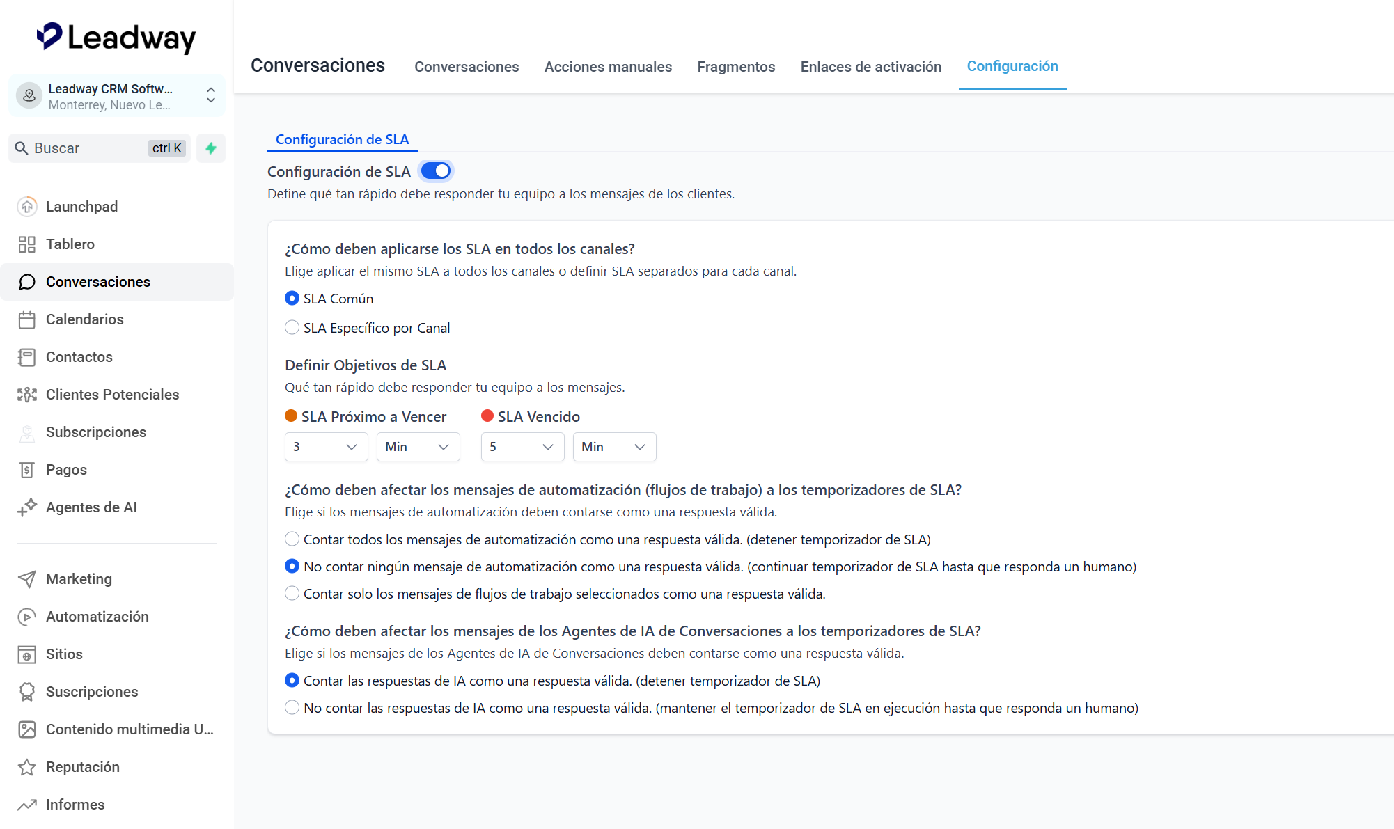 - Ingresa a la herramienta de conversaciones > configuración > SLA