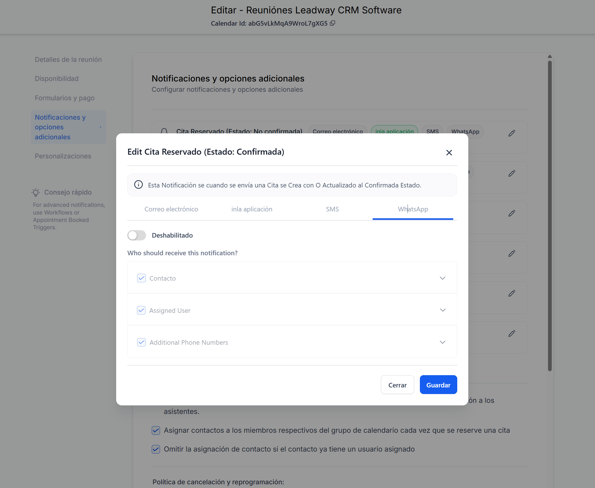 Las notificaciones de citas ahora también pueden enviarse por WhatsApp, además de correo electrónico dentro del modulo de calendarios, sin necesidad de tener que crear una automatización.