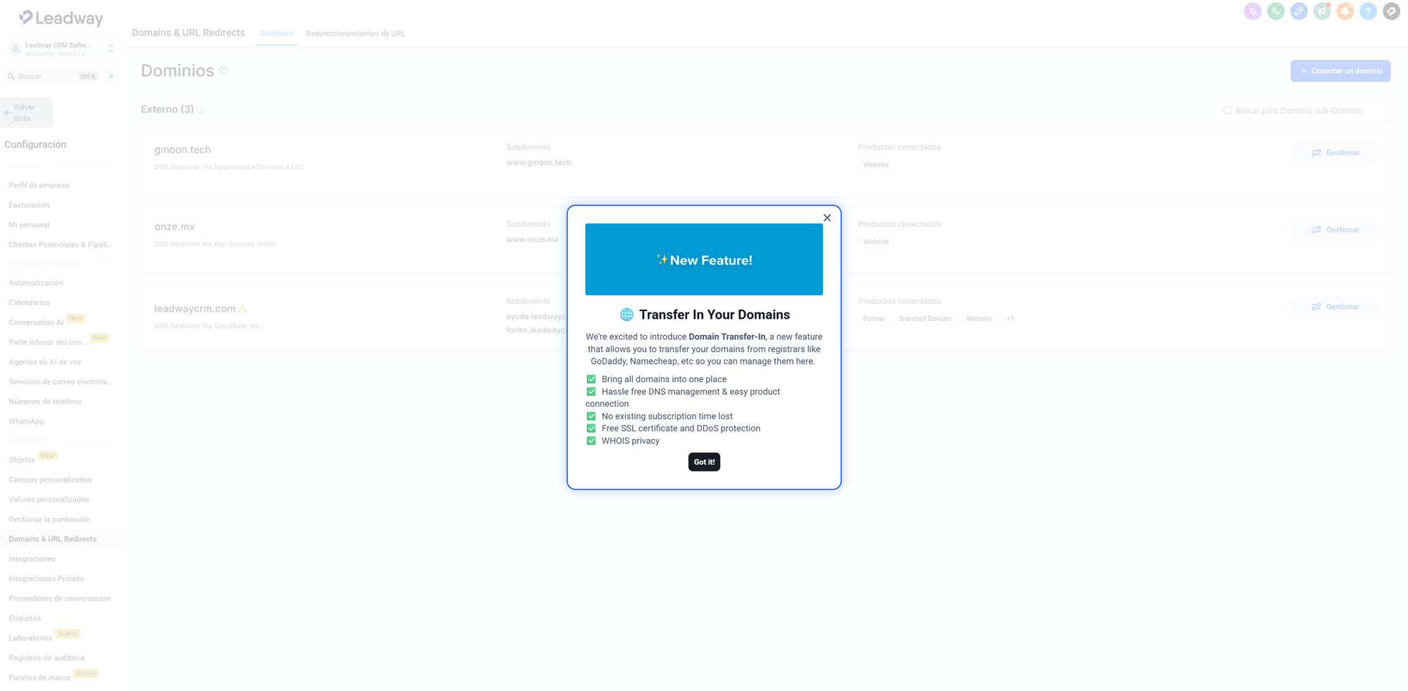 Ahora puedes transferir dominios desde registradores como GoDaddy, Namecheap y otros directamente a tu cuenta de Leadway, centralizando por completo la gestión de dominios dentro de la plataforma.