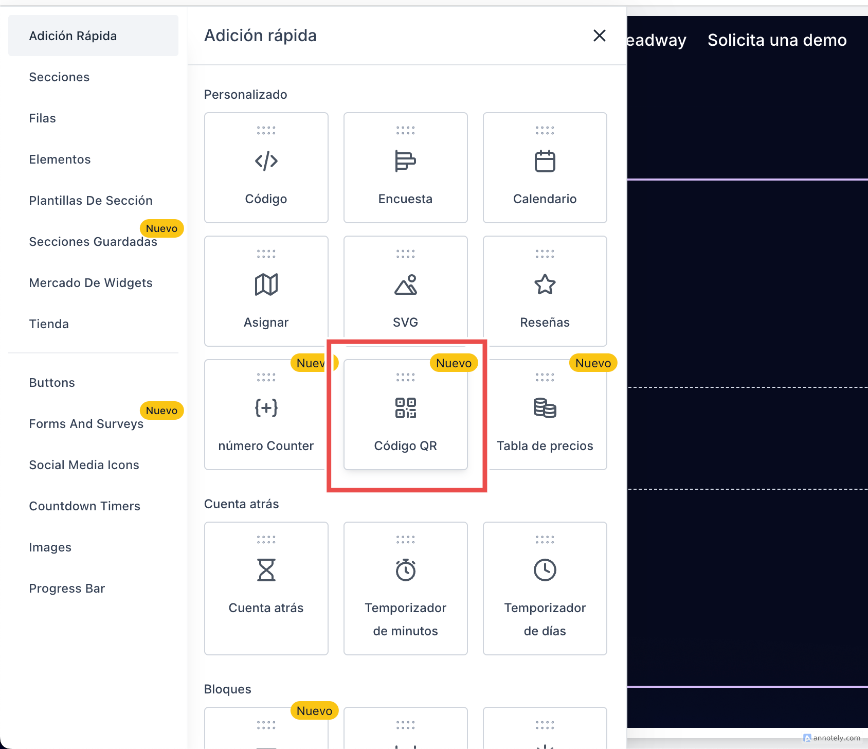 - Abre el Constructor de Páginas y agrega el elemento de Código QR.